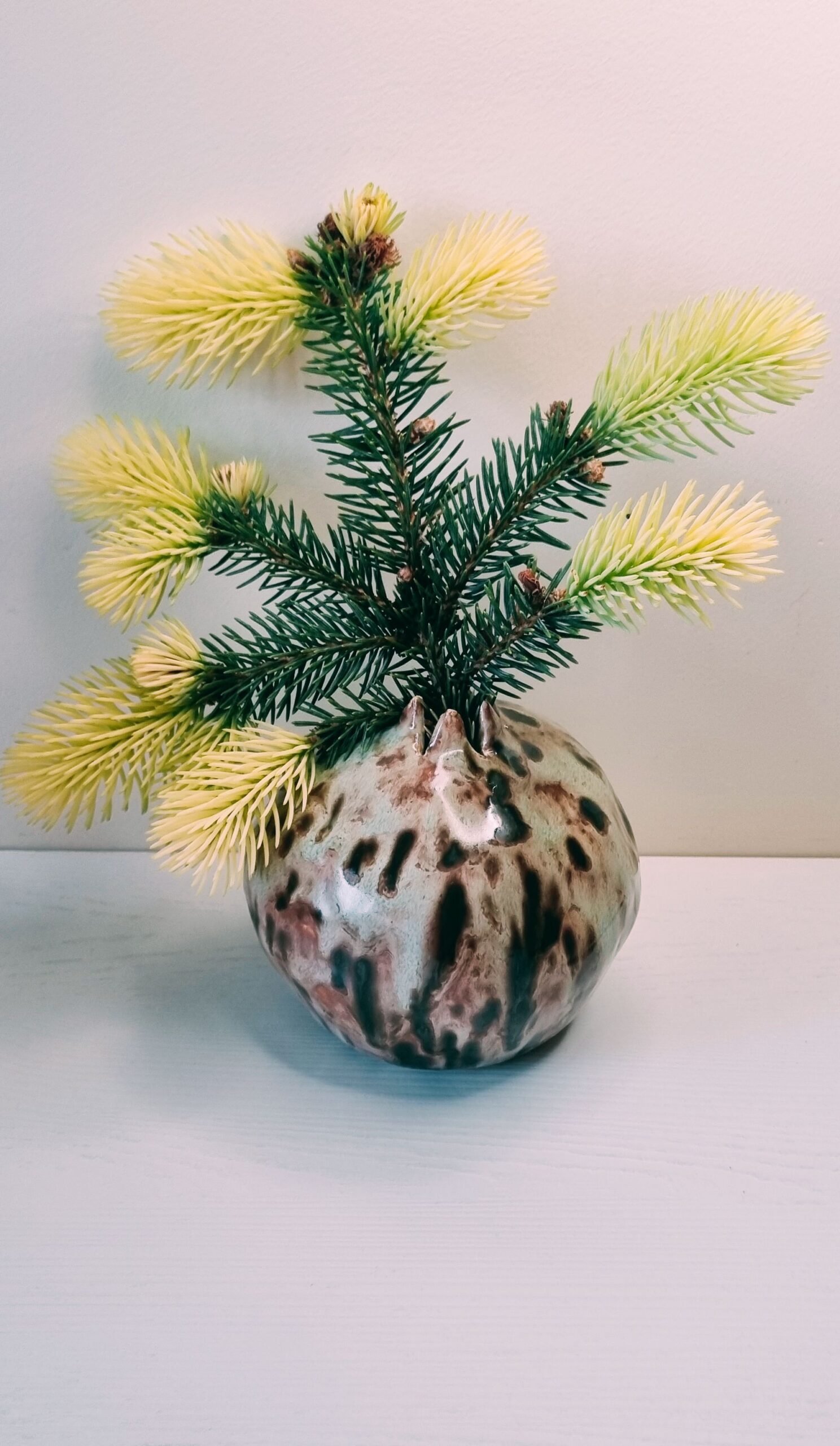 „Rūko vaisius“ – tai ne tik vaza, tai nedidelė gamtos mįslė, kurią galima laikyti rankose. Tamsūs potėpiai glazūroje primena brandą, o lengvas blizgesys – ryto rasą. Puikiai dera tiek prie laukinės šakelės, tiek prie minimalistinio interjero.