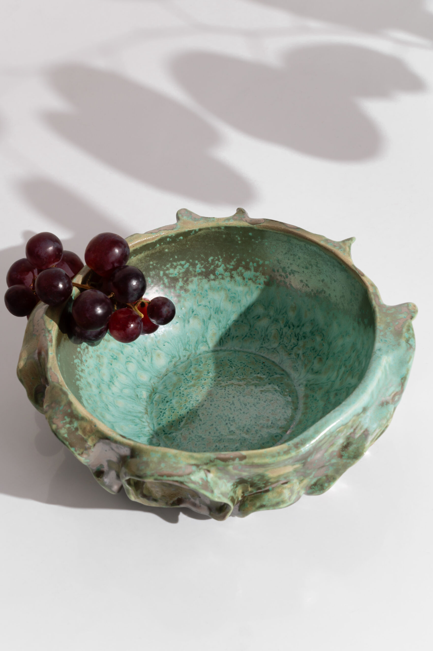 Šis dubuo – lyg senovinės miško versmės atspindys. Tamsiai žali, samaniniai, žemės tonai susilieja su glazūros žaisme, primindami lapų paviršių po lietaus. Jo banguoti kraštai tarsi natūraliai susiformavę gamtoje, o vidaus tekstūra – kaip kerpėmis nusėtas akmens dugnas.